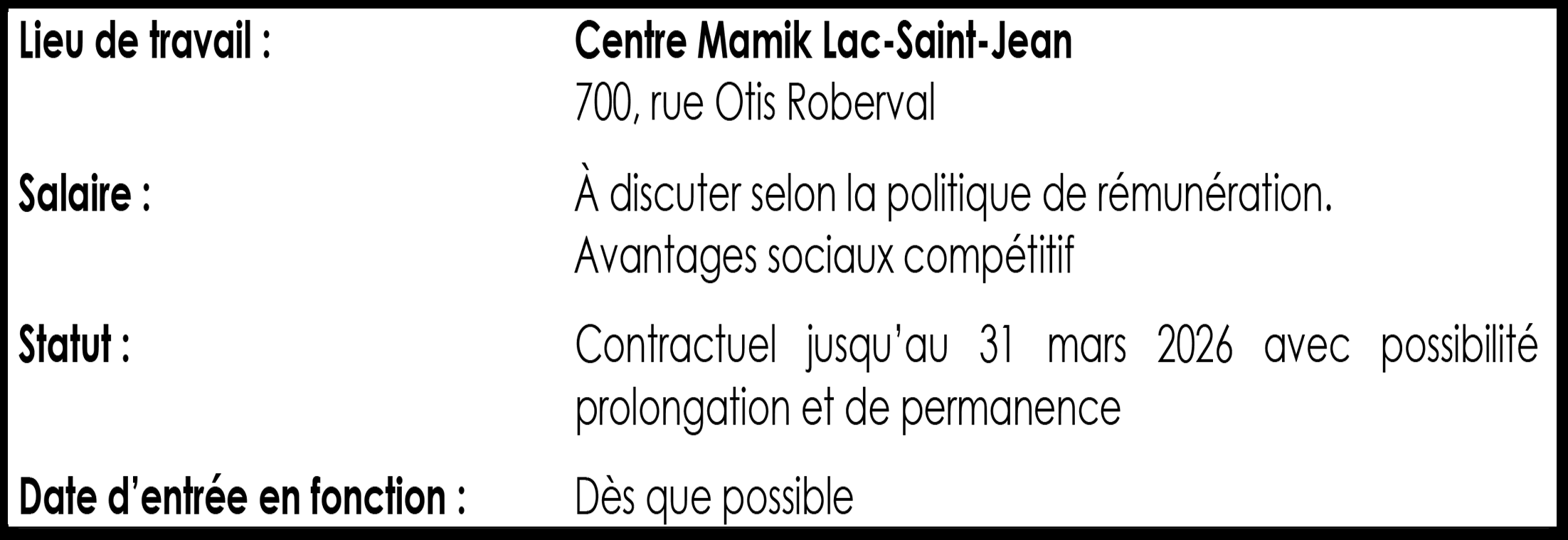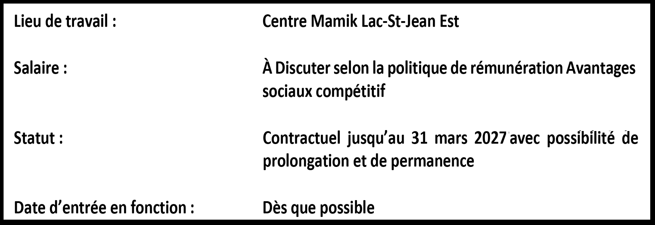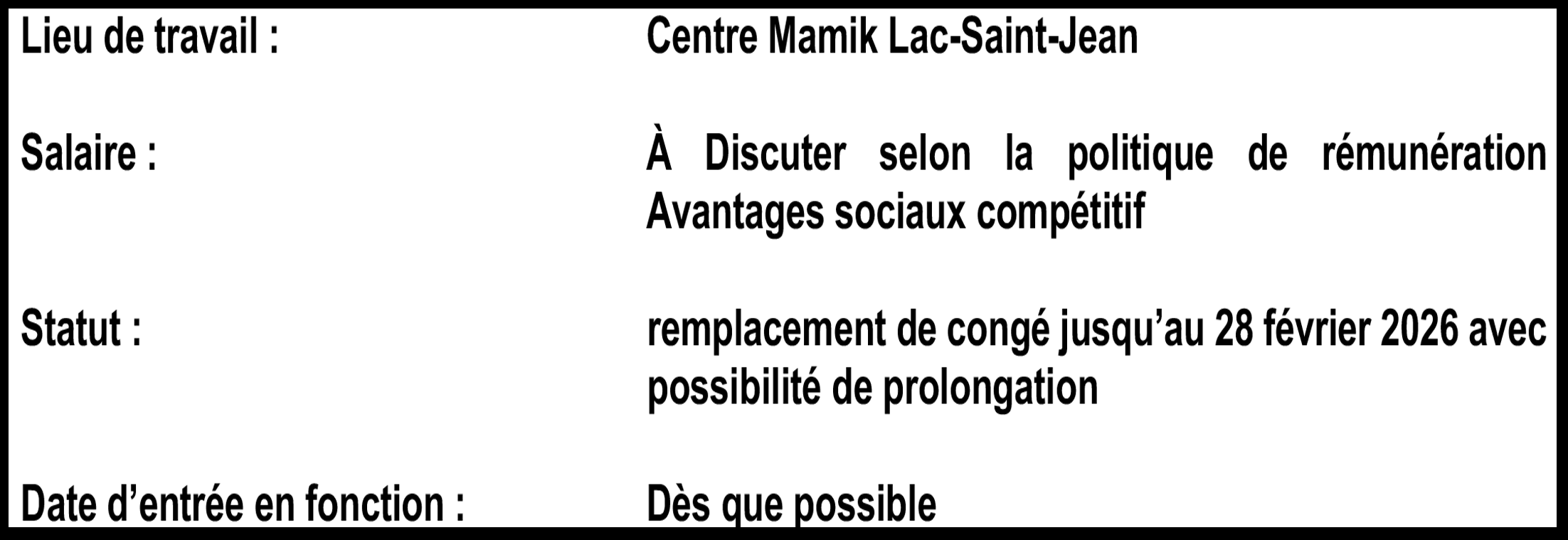 Sous la supervision de la direction du Centre Mamik Lac Saint-Jean le titulaire du poste assume, selon les règles de sa profession, la responsabilité des interventions au niveau psychosocial en fonction des besoins des clients qui lui sont référés. Il assure aux personnes une relation d’aide favorisant l’approche holistique et voit à responsabiliser l’individu dans sa démarche de guérison.  Il exerce des activités de conception, d’actualisation, d’analyse, d’évaluation et d’orientation auprès de la clientèle. Il intervient de façon prioritaire auprès des familles autochtones et travaillent en étroite collaboration avec les partenaires locaux.